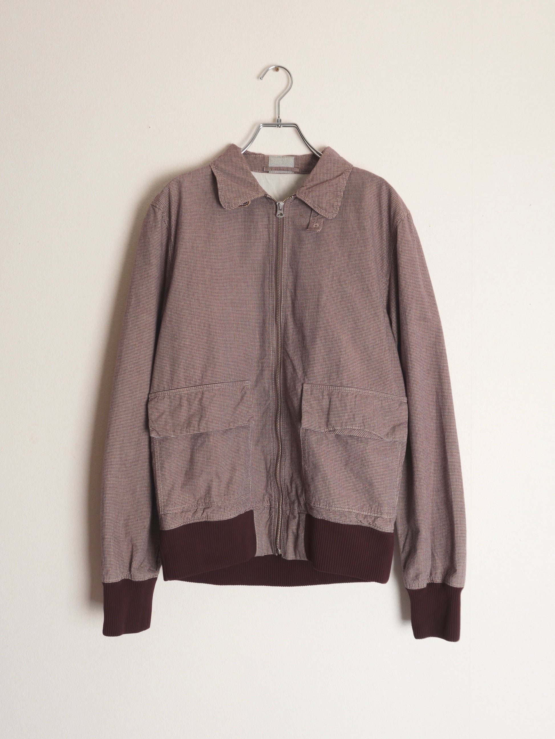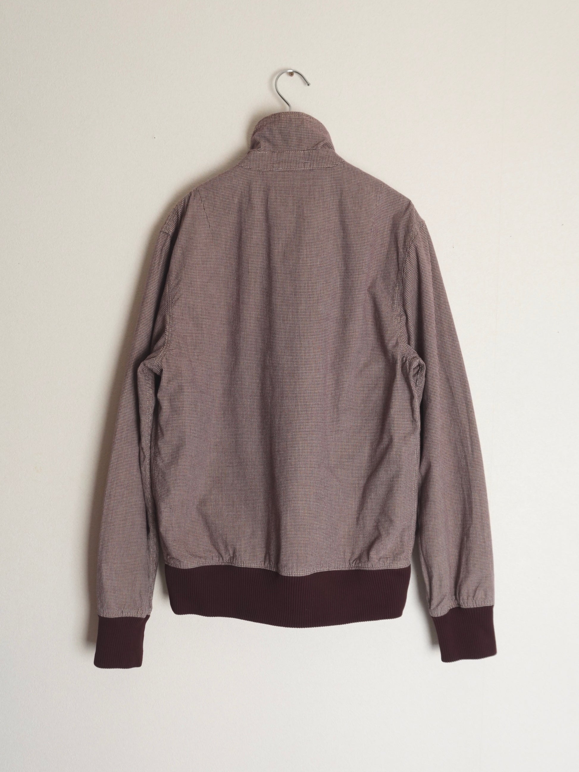ギンガムチェックの身頃に、リブのボルドーカラーが引き締めます。