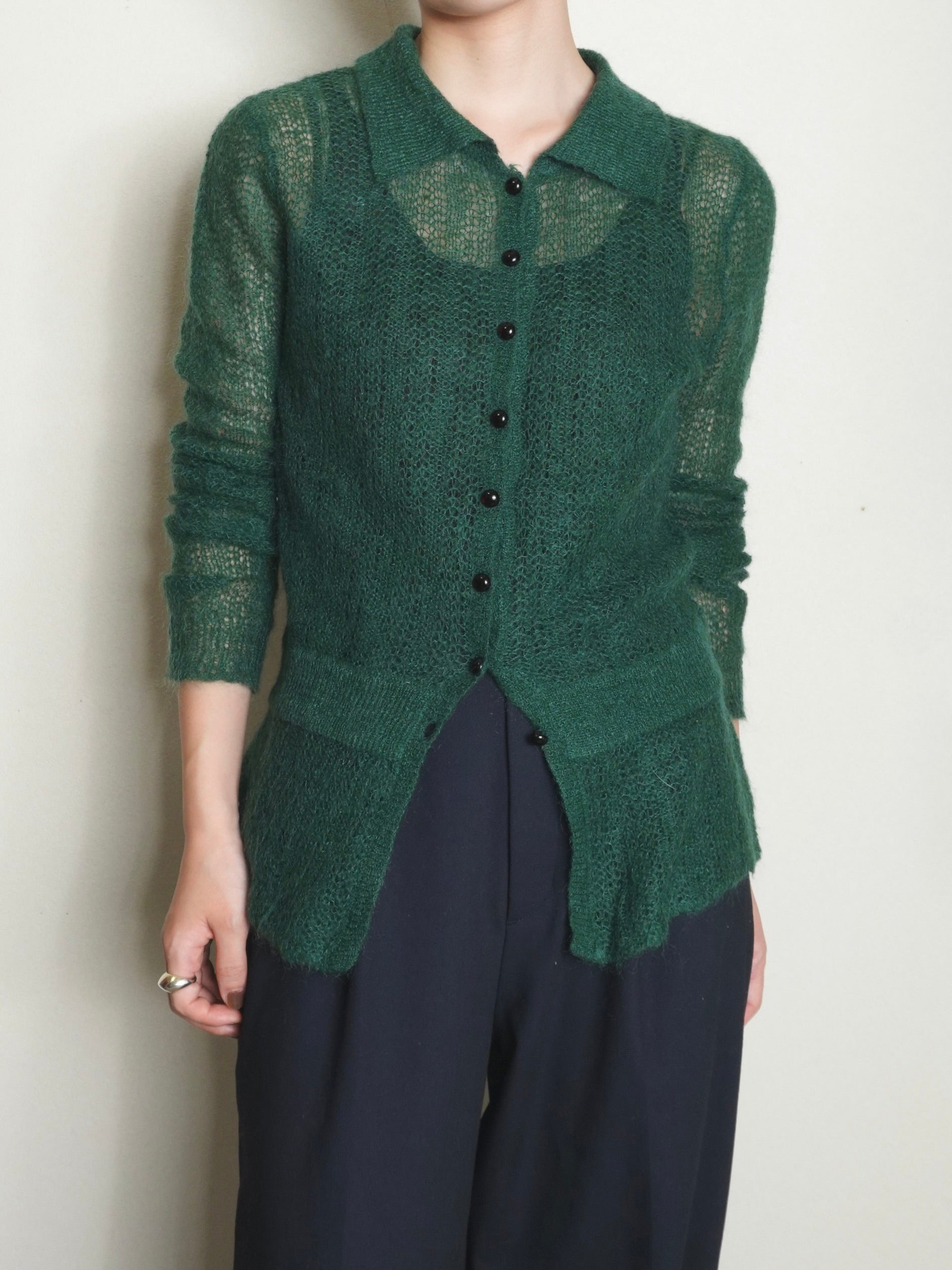 細やかな編み地に小ぶりなボタンが並び、すっきりとしたシルエット。