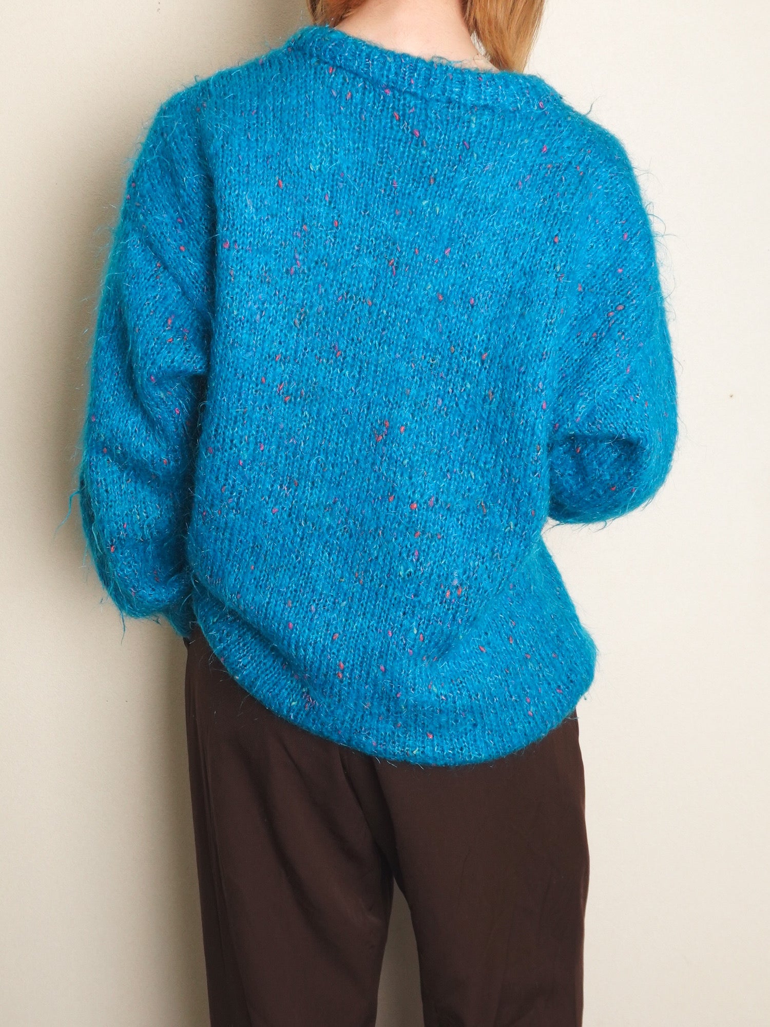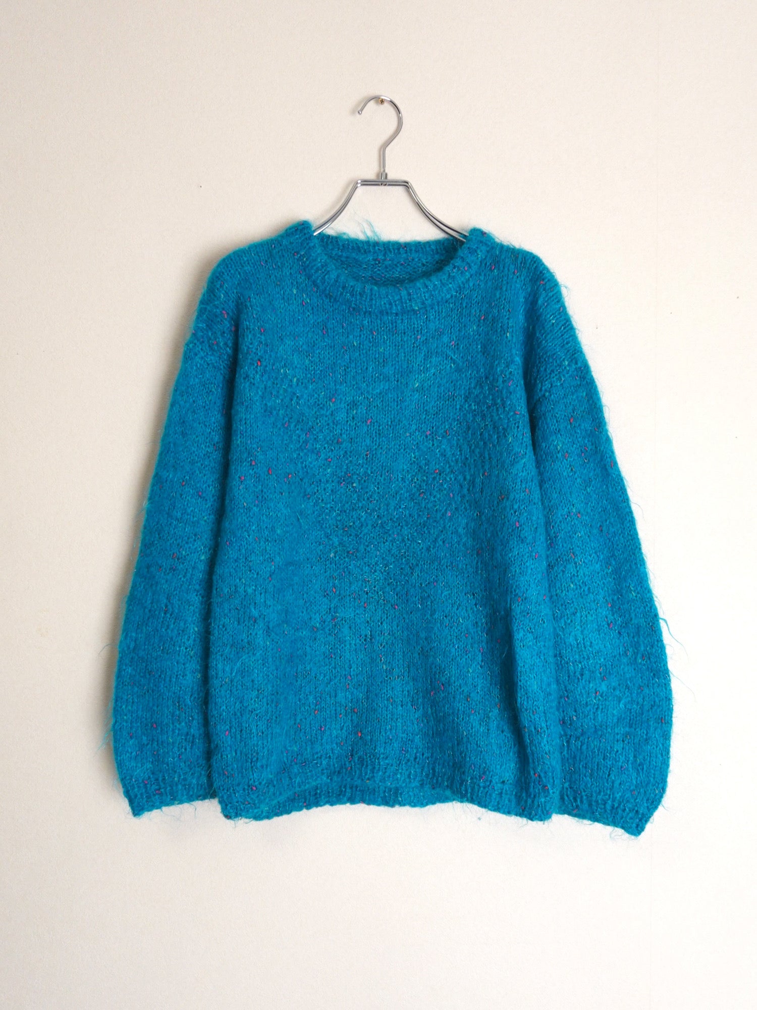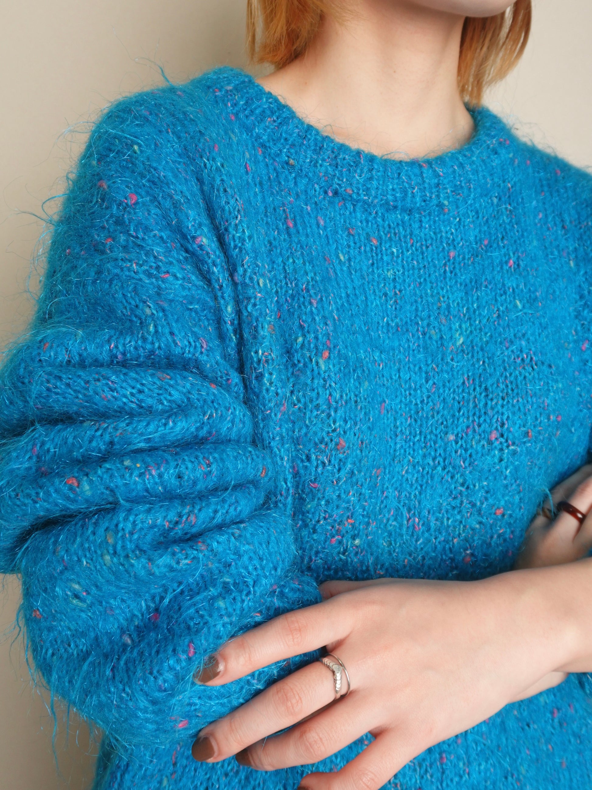 鮮やかなターコイズブルーに、さりげなく色糸が混ざったミックス素材が可愛いニット。